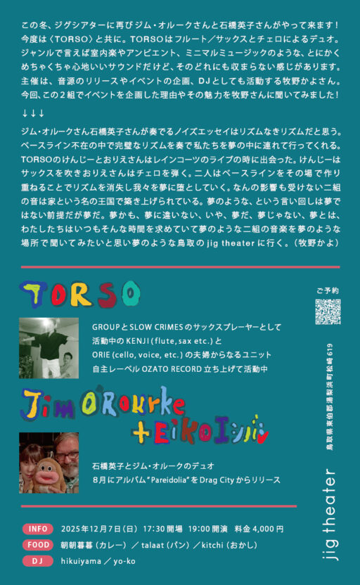 この冬、ジグシアターに再びジム・オルークさんと石橋英子さんがやって来ます!今度は〈TORSO〉と共に。TORSOはフルート/サックスとチェロによるデュオ。ジャンルで言えば室内楽やアンビエント、ミニマルミュージックのような、とにかくめちゃくちゃ心地いいサウンドだけど、そのどれにも収まらない感じがあります。主催は、音源のリリースやイベントの企画、DJとしても活動する牧野かよさん。 今回、この2組でイベントを企画した理由やその魅力を牧野さんに聞いてみました!